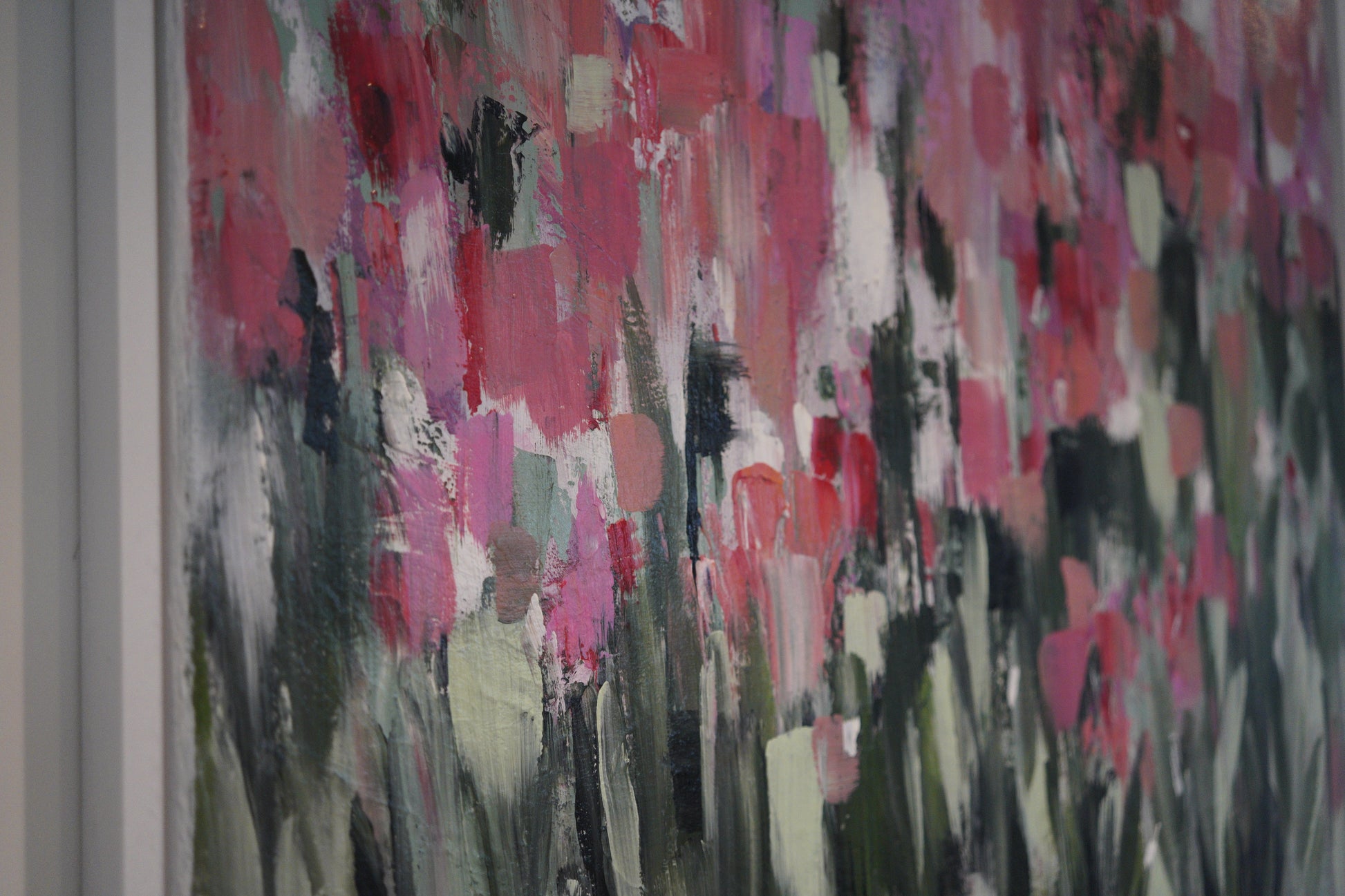 Dreamer is an abstract dreamy piece full of elements reminicient of a pretty summer garden. The coral, pink and green palette make it a vibrant addition to your space.