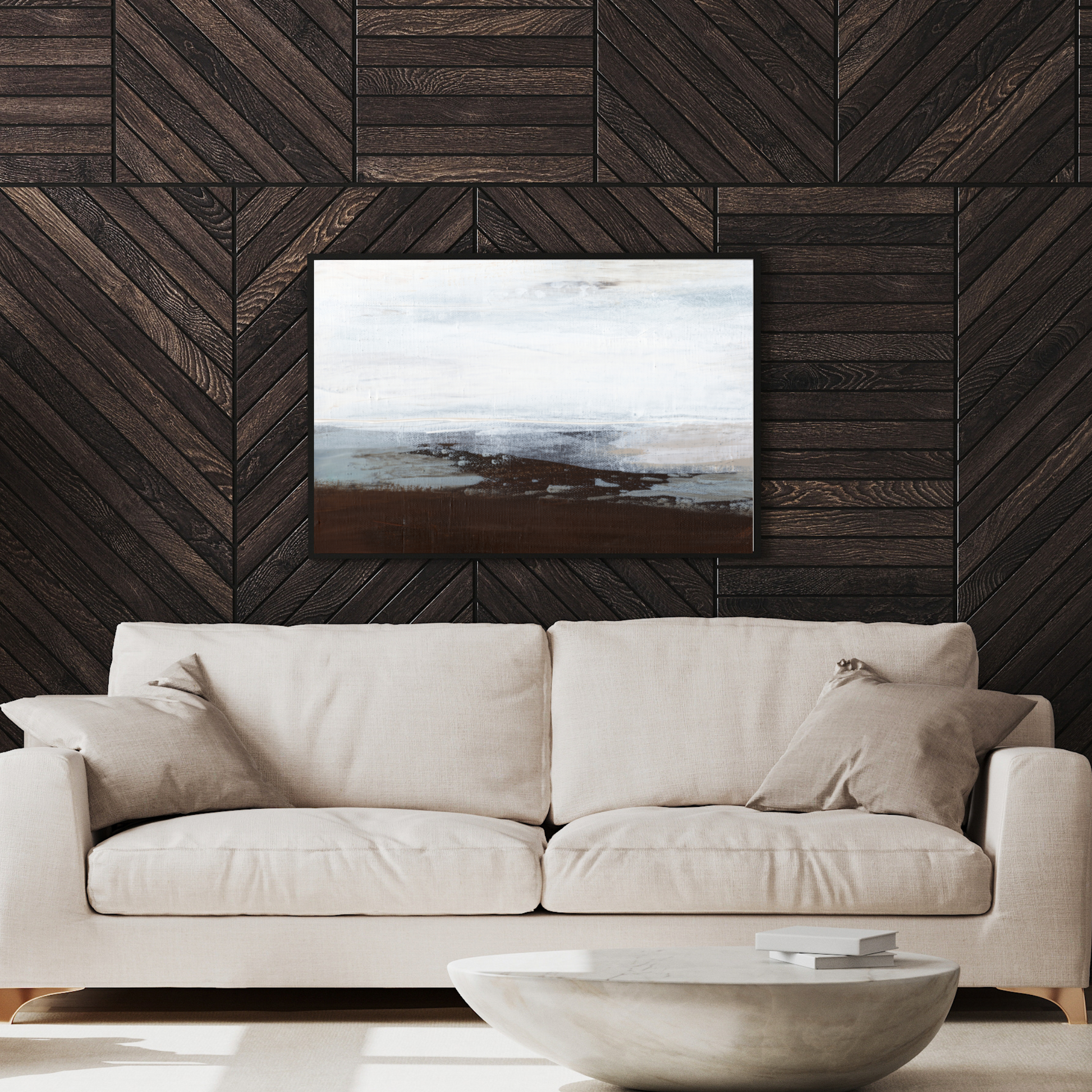 An abstract work with moody neautrals and hints of blue. This neutral work is done in acrylic. Expect to see brush marks and canvas texture. A soothing earthy colour palette to make your space calmer.