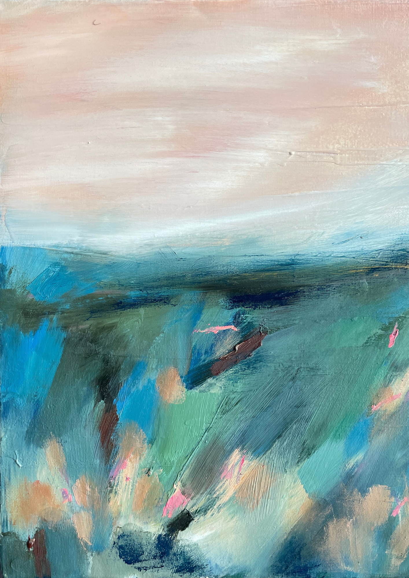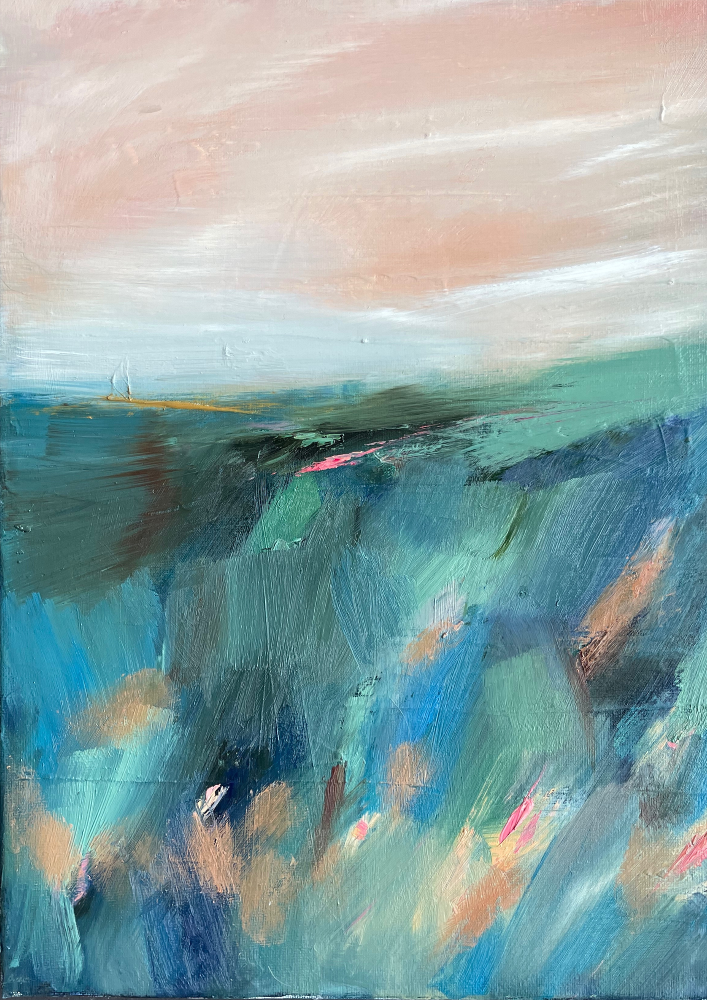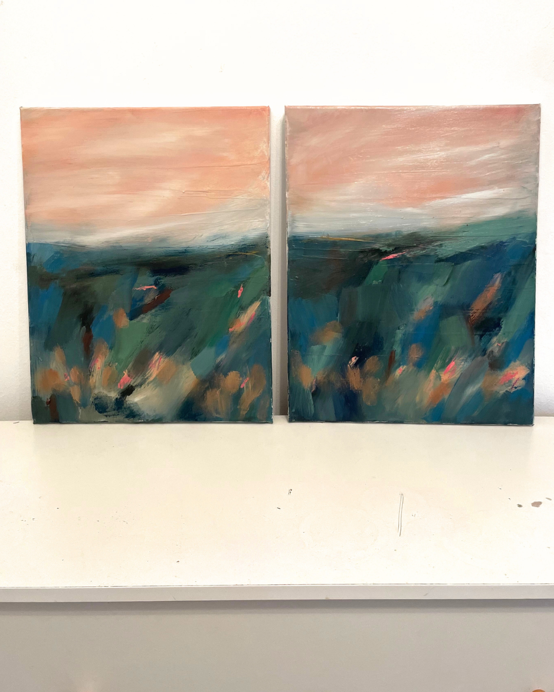 African Dream is a Set of small paintings inspired by the African bushveld. Beautiful peaches in the sky and deep greens and blues in the landscape with pops of colour make this set small but mighty.