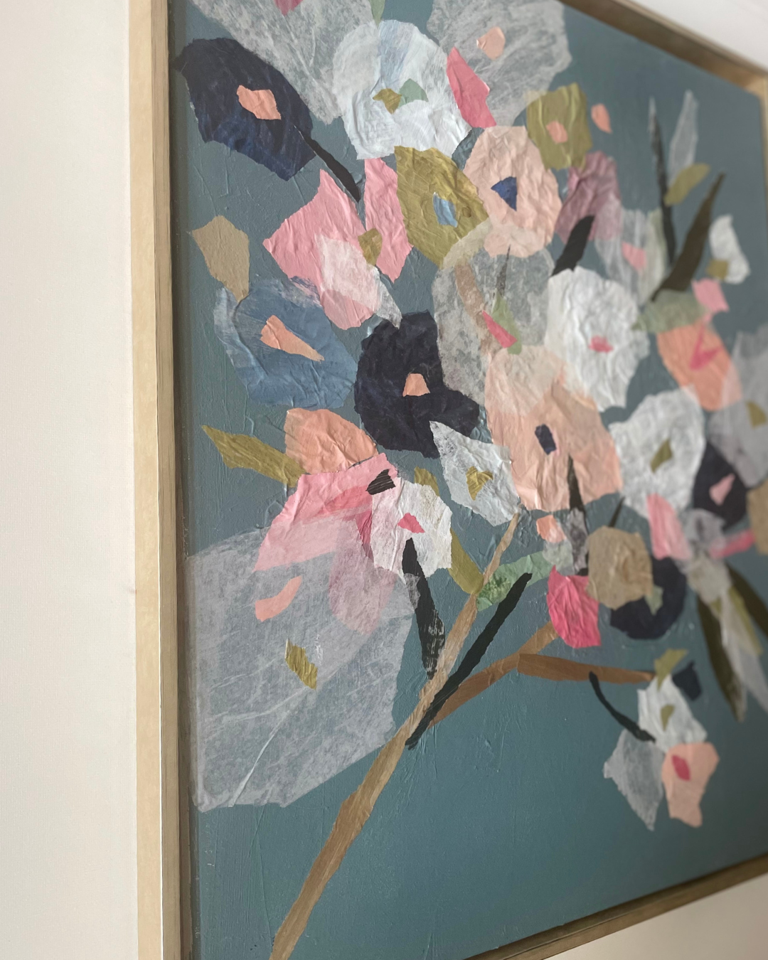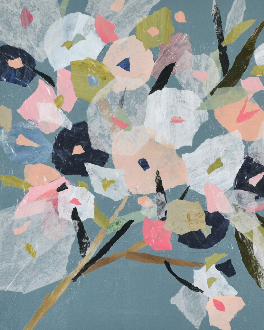 Bursting is a floral piece bursting with life yet full of calm blues and neutrals.