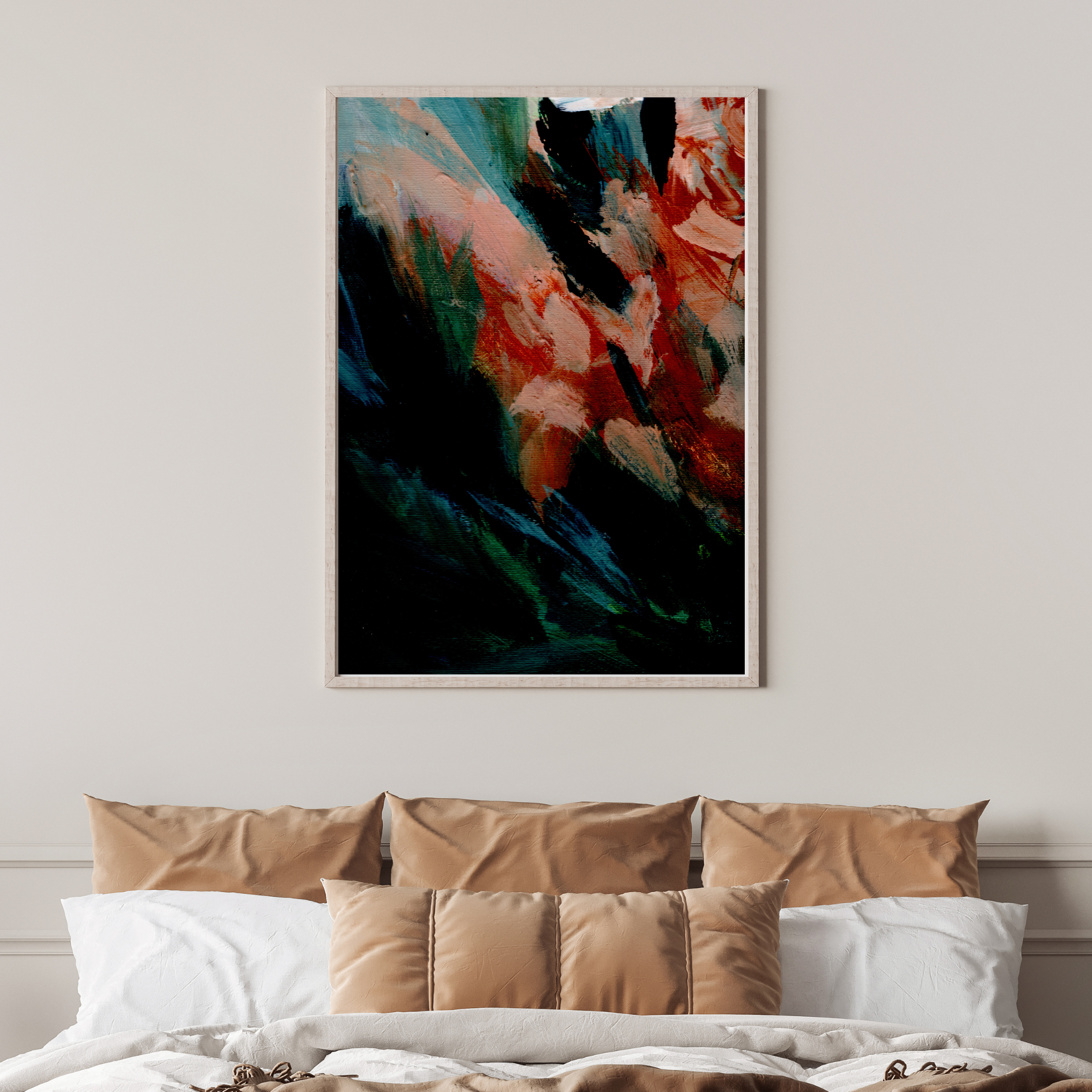 On Trend with Pantones Colour of the Year - 'Peach Fuzz'- this abstract work is moody, tropical and full of body. Expect to see brushstrokes and canvas texture giving an authentic feel to these prints.