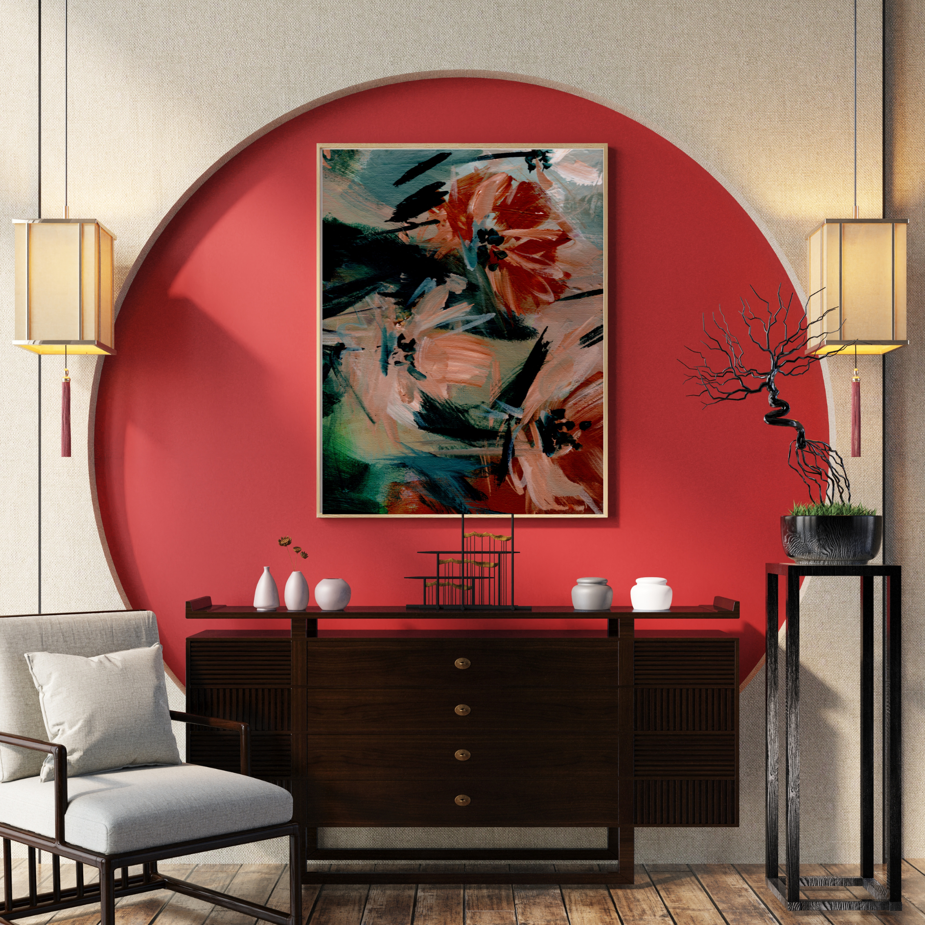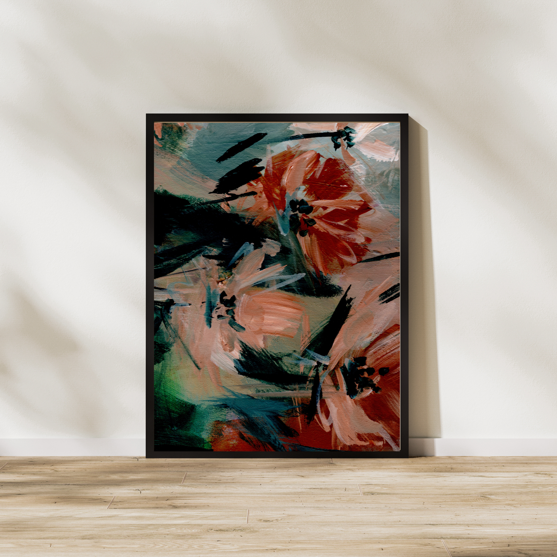 On Trend with Pantones peachy colour of the Year - 'Season of Singing' is an abstract floral work which is celebratory in movement and daring brush strokes. A joyful flash of floral peaches and moody greens.